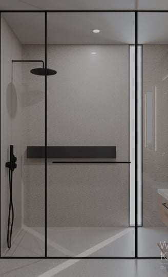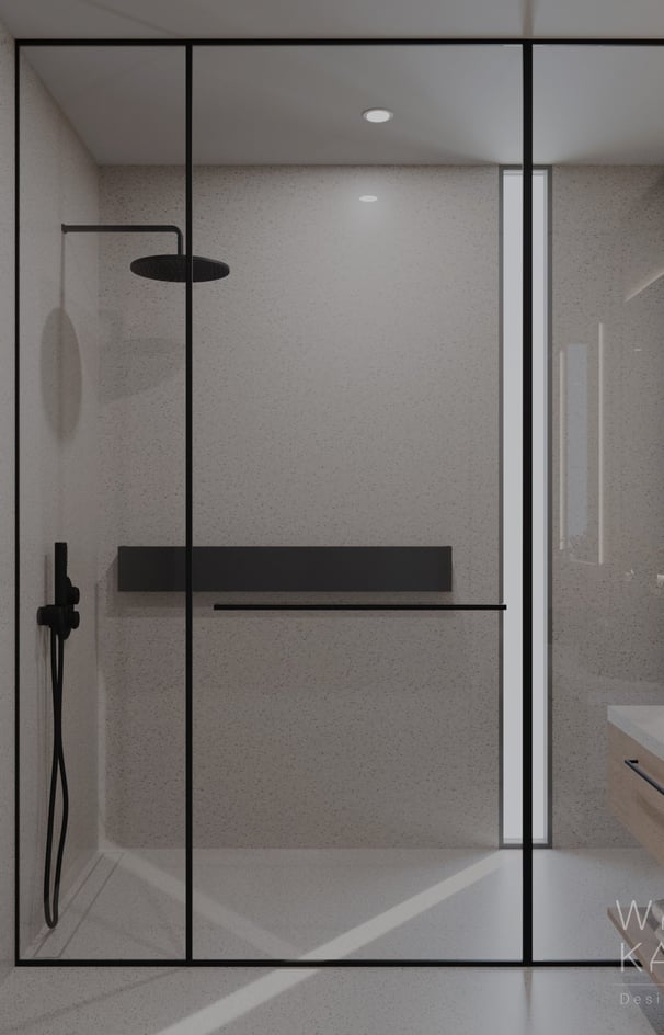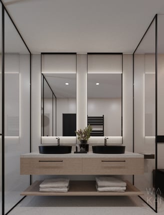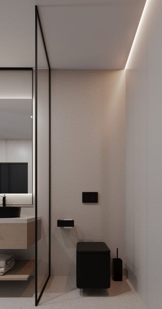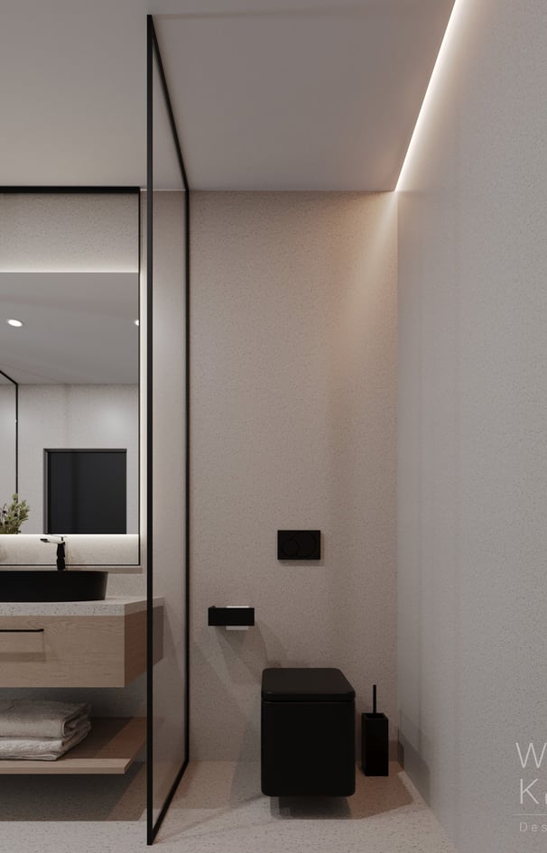 Elegantiškas vonios kambario projektas, kuriame dominuoja šviesios spalvos, juodi akcentai ir minimalizmas. Funkcionalumas derinamas su estetika, sukuriant švarią ir ramią erdvę kasdieniams ritualams.